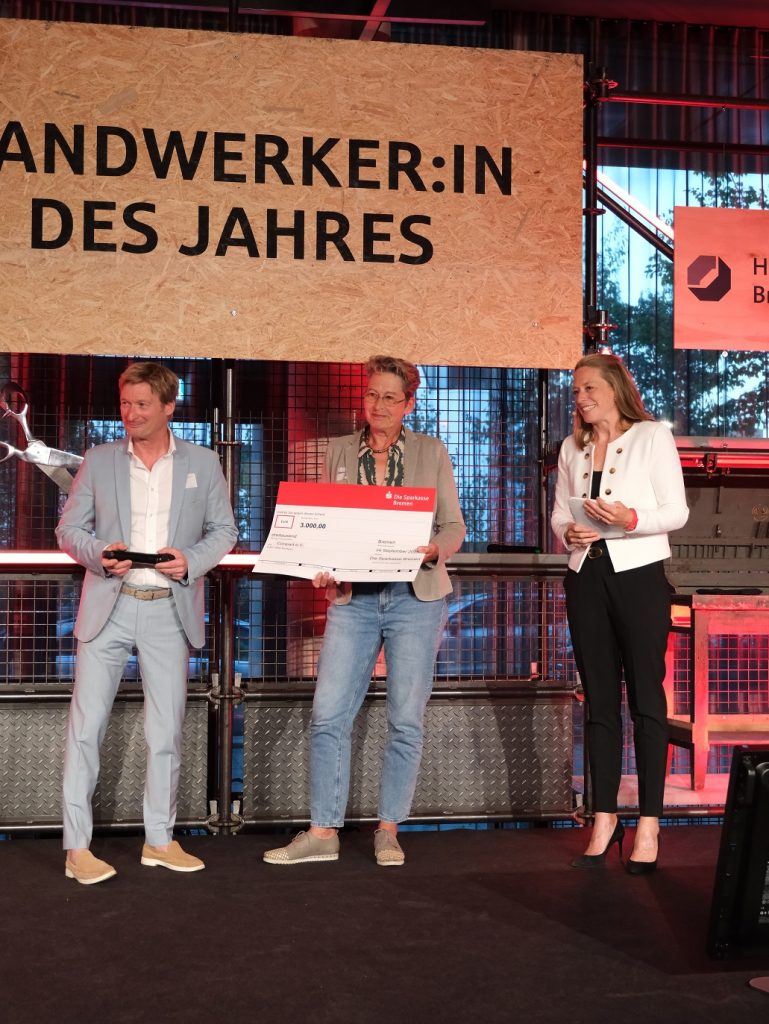 Das Preisgeld in Höhe von 3.000 Euro spendet Stefan Hagens an den Verein Conpart. Dessen 2. Vorsitzende Gerhild Alf (Mitte) nahm bei der Preisverleihung in der Sparkasse Bremen den symbolischen Scheck entgegen. Moderatorin Carlotta Polter führte durch den Abend.