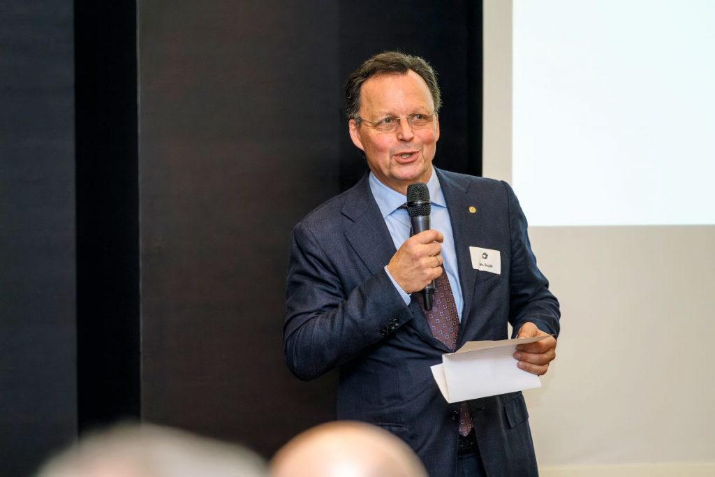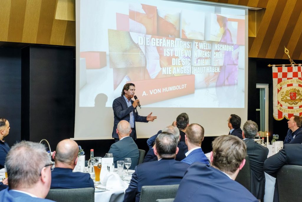 Als Gast referierte in diesem Jahr Dr. Carl Naughton. Naughton bezeichnet sich selbst als Transformationspsychologe, Neugierforscher und Experte für Zukunftskompetenzen. Er entwickelt Ansätze, wie Menschen und Organisationen neugierig, mutig und anpassungsfähig in die Zukunft gehen können. Mit guter Laune und Humor vermittelte der Referent den faszinierten und auf den Vortrag konzentrierten Anwesenden Einblicke in seine Forschung. Diese nimmt die sogenannten „4 Open Minds“ in den Fokus: Neugier, Zukunftsmut, Anpassungs-Intelligenz und Orientierungsfähigkeit. Dabei ging er insbesondere auf die Anpassungs-Intelligenz ein und stellte dabei dar, dass im 21. Jahrhundert nicht