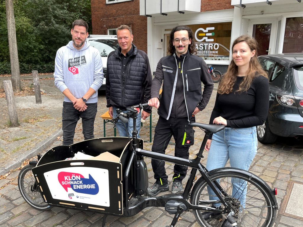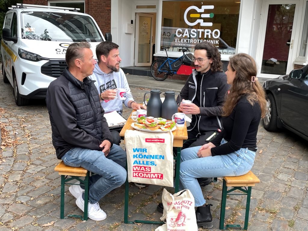 Zum Auftakt zur neuen Klönschnack-Runde haben sich Marcel Johannsen (energiekonsens), Marco Appel (Handwerkskammer), Castro Arias (Castro Elektrotechnik) und Maximiliane Wenge (energiekonsens, v.l.) vor dem Betrieb Castro Elektrotechnik getroffen.